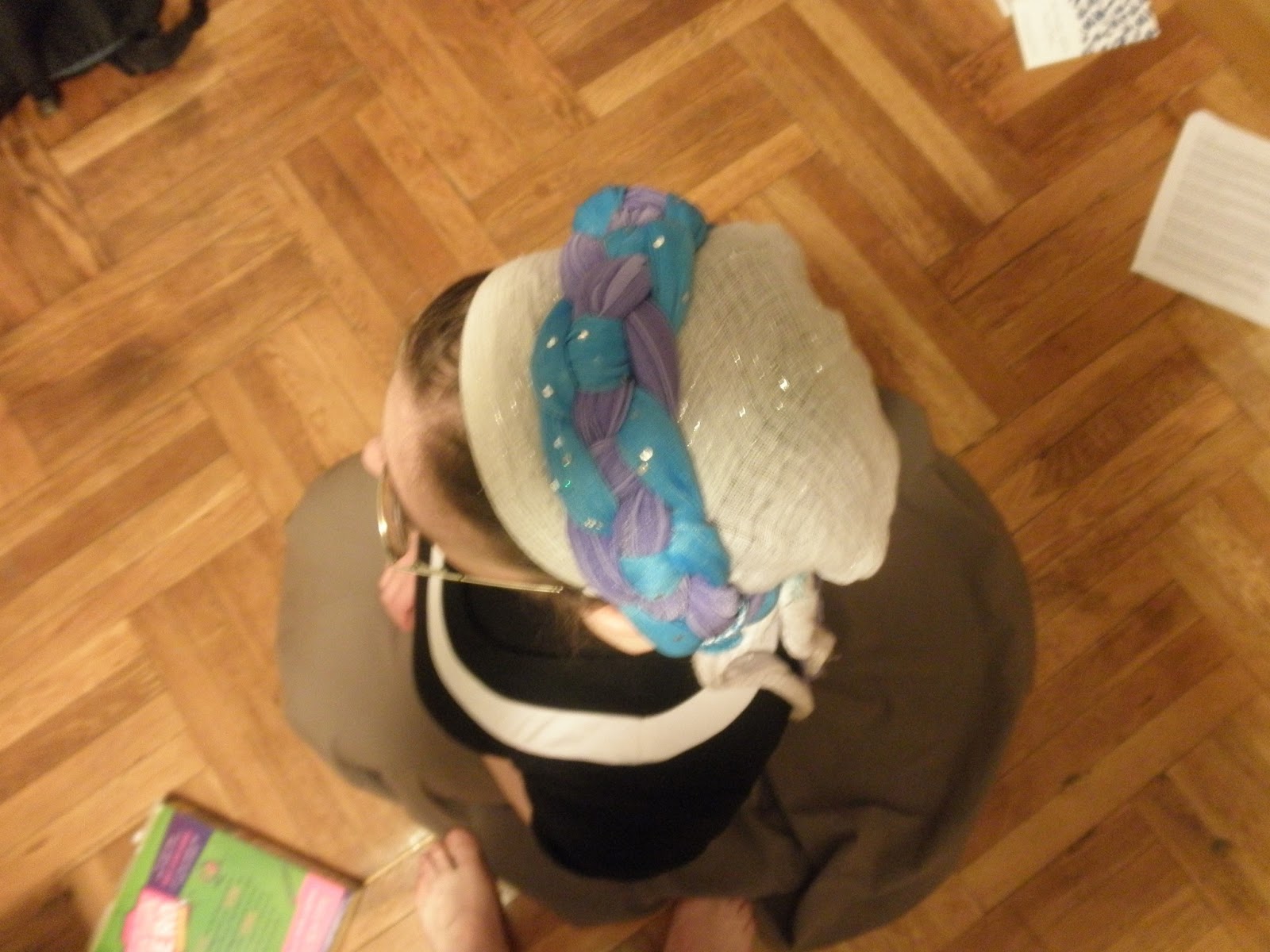 I secured the first end with a hair clip, while I braided, then brought the ends together at the back of my head and used a hair elastic, covered with a scrunchie, to secure the ends. The tails have a lot of bulk, rather reminiscent of a decorative head-band I saw on a little girl at shul recently- it had lots of ribbons hanging down in the back.